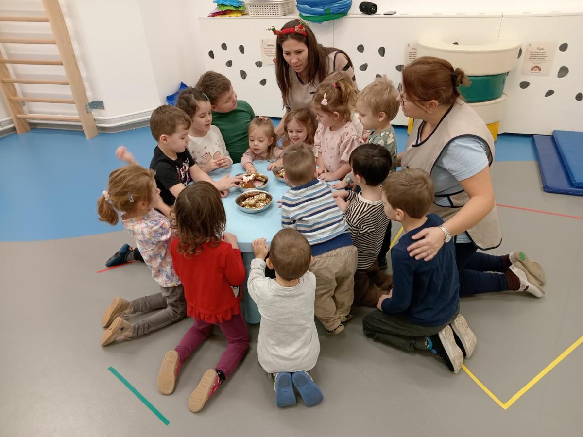 Karácsonyi dalokkal és közös tánccal hangolódott a közelgő ünnepekre az újvidéki Málna és Alma csoport. A vidám együttlétet tovább színesítette a közösen készített mézeskalácsok elfogyasztása, amely igazi közösségi élménnyé vált a gyermekek számára. A meghitt, ünnepi hangulat mindenkinek maradandó élményt nyújtott. A karácsonyfa alatt pedig – a szülők figyelmességének köszönhetően – apró meglepetésajándékok várták a gyerekeket.